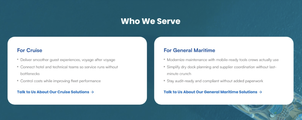 Rather than relying on a single generic CTA, they place targeted prompts within relevant sections. For instance, they use “Talk to Us About Our Cruise Solutions” and “Talk to Us About Our General Maritime Solutions” so each visitor gets a next step that matches exactly what they were just reading.