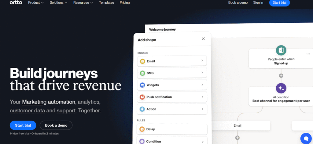 Ortto helps you stop treating channels like separate silos. A SaaS company I worked with used it to sync onboarding emails with in-app messages and retargeting ads, all within the same workflow. When a new user signed up but didn’t complete the setup in 24 hours, Ortto would send a helpful push notification. If they still didn’t finish after 48 hours, the system automatically scheduled a custom Facebook ad reminding them. No human touched that part. It’s what let their tiny growth team behave like they had 10 more people. You can see the logic and flow at a glance, it’s visual, not buried in menus.