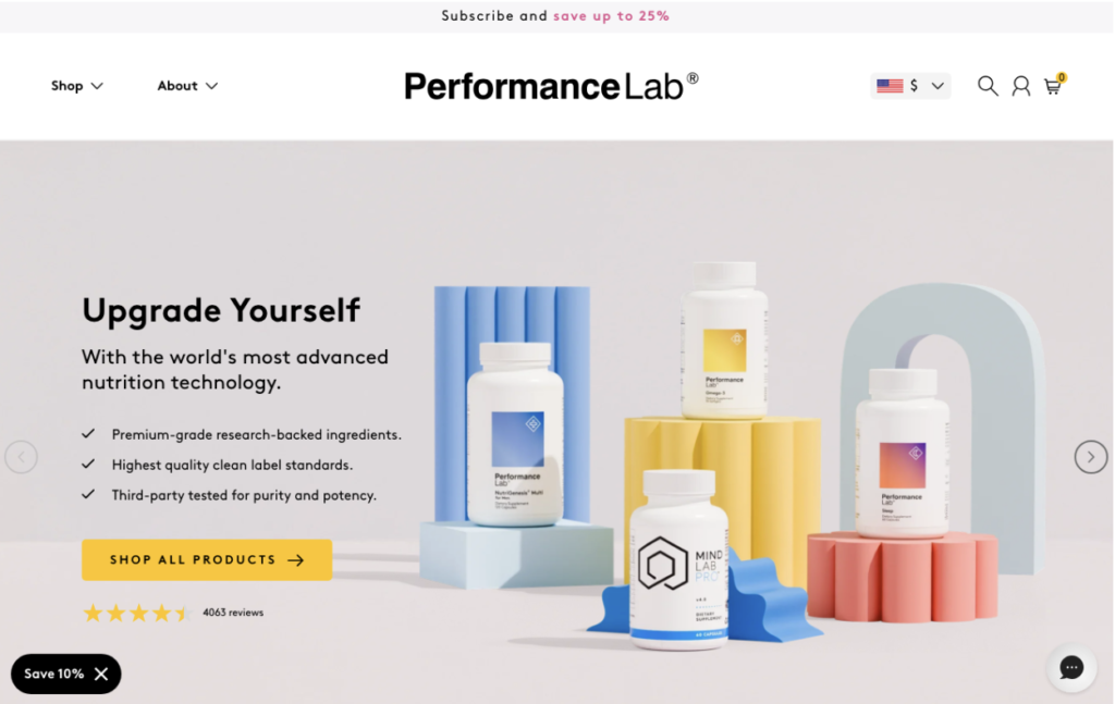 For example, take a look at how Performance Lab achieves this in the hero section of its homepage. Here, the business strongly emphasizes that its products are all clean, premium-grade, science-based supplements that work. This approach works for two reasons.