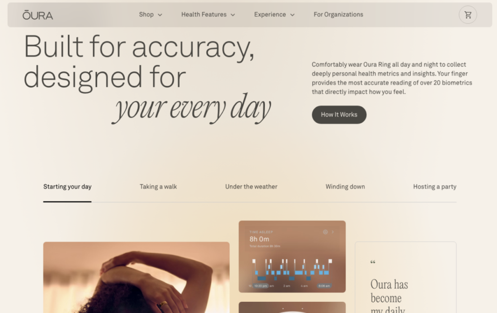 For example, Oura does it by dedicating a significant portion of its digital presence to explaining how its smart ring works. On the one hand, the brand utilizes homepage messaging to provide visitors with brief explanations of what the wearable device does and how it benefits customers. On the other hand, it also invites prospects to take a deeper dive into a dedicated How It Works section, where Oura guides prospects through every single scenario in which its solution can provide customers with feedback, data, or guidance.