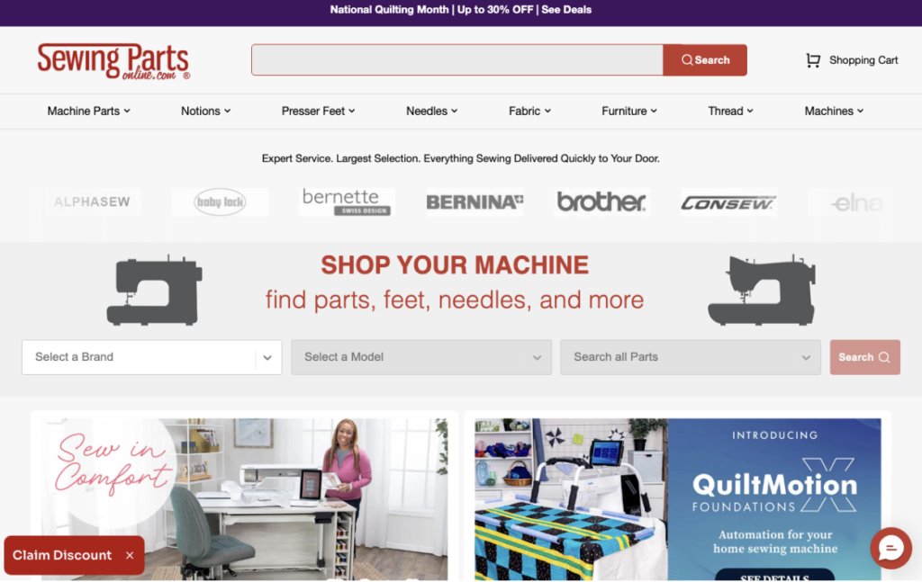 For example, check out how Sewing Parts Online implements this tactic on its homepage. Given that it sells several tens of thousands of products, this business designed a user-friendly process to help prospects find the spare parts they need. First of all, Sewing Parts Online invites web visitors to “shop [their] machine,” then it instructs them to select their preferred brand, model, and part type. This process might be slightly more complex than the typical navigation menu. Nevertheless, it ensures that potential customers receive relevant product suggestions for their needs, thereby improving their customer experience and increasing their likelihood of finding what they need to resolve their pain points.