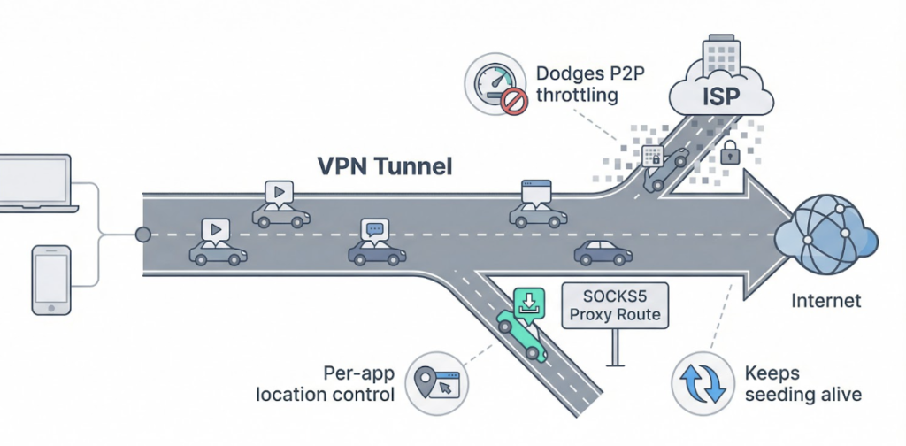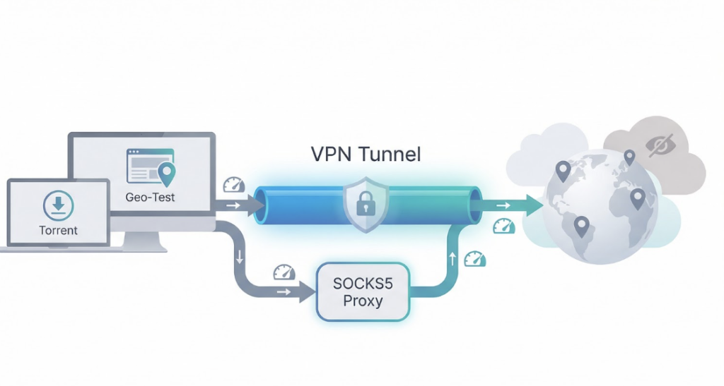 A SOCKS5 proxy adds a side road. You steer a single app (often your torrent client or a marketing tool) onto that route while everything else cruises on the main VPN highway or even stays on your normal connection. The proxy swaps that app’s IP instantly and skips heavy encryption, so transfers stay quick.