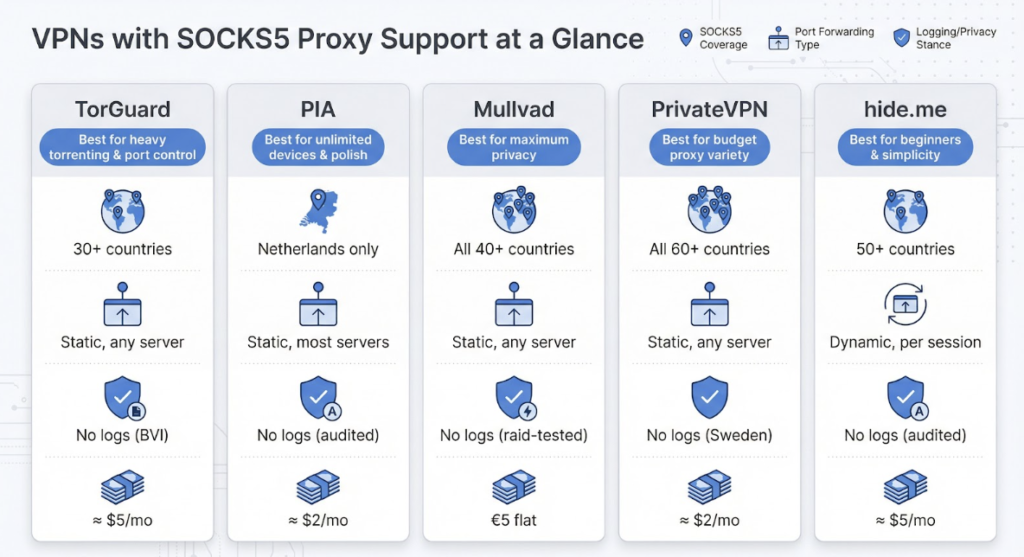 TorGuard cleared this bar with room to spare; its support article publishes per-city SOCKS5 hostnames such as ny.proxy.torguard.org and nl.proxy.torguard.org, complete with alternate ports for stubborn networks.