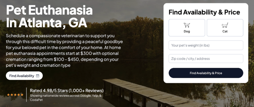 Their city-specific landing pages, like the one for pet euthanasia in Atlanta, get this right immediately. The header text tells visitors exactly what the service involves, confirms that a qualified vet will be present, emphasizes the comfort of a home setting, and lists starting prices upfront, including cremation options.