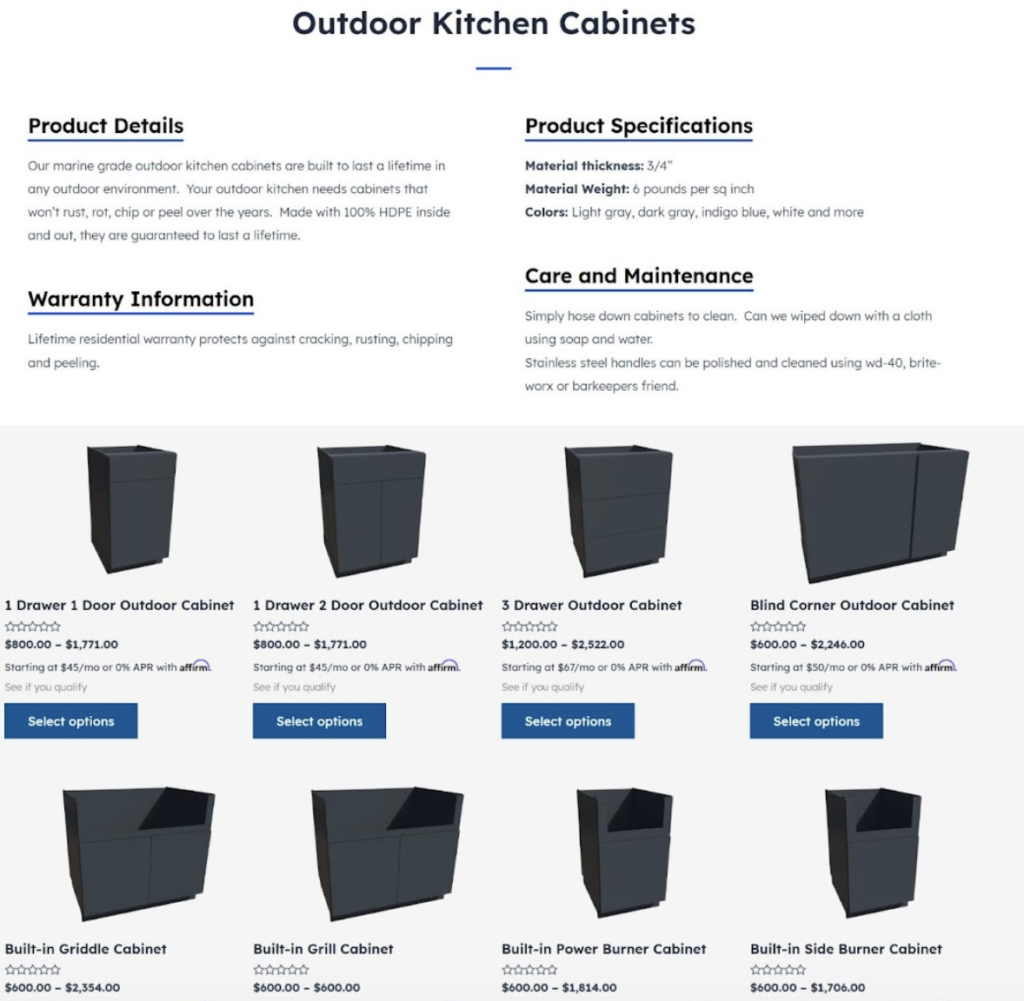 Their HDPE outdoor kitchen cabinets page puts this method into practice effectively. High-quality imagery, deliberate sectioning, and a well-organized layout work together to move visitors through the page naturally. That way, key information surfaces at the right moments.