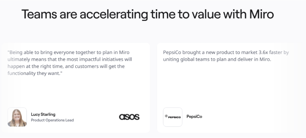 On their product acceleration landing page, Miro places client testimonials directly after their feature showcase. Each testimonial includes the client’s photo, name, company, and role. These are details that make the source verifiable and credible.