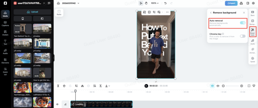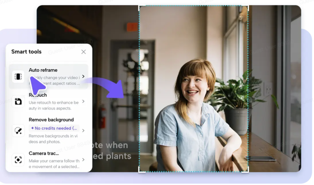 - Inside the editor, open “Smart tools” and select “Auto reframe” from the available feature list.