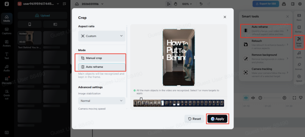 - Choose “Manual crop” or “Auto reframe”, then press “Apply” to adjust the video frame.