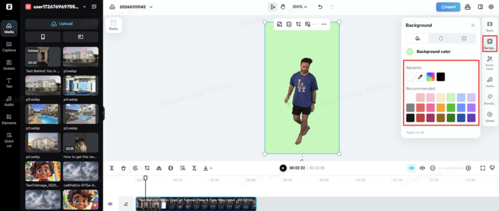 6. Then open the “Background” settings and insert a solid color, a stock video, or supporting marketing visuals.