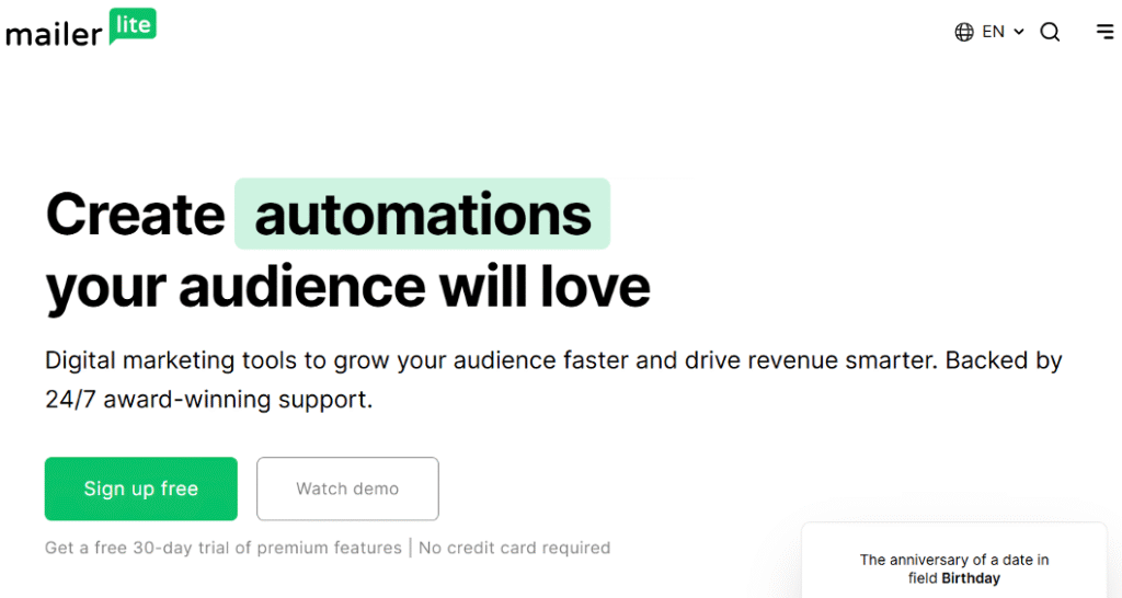 MailerLite is a reputable email service offering a suite of marketing tools beyond email, such as a website builder and digital selling options. While it’s especially helpful for creators looking to monetize a blog or newsletter, it’s also a good choice for online stores that want simple yet effective automations.